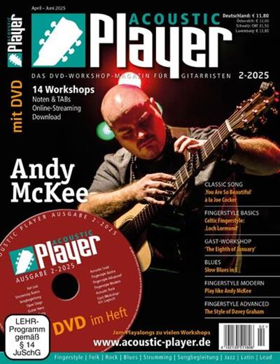 A revista Acoustic Player, publicada na Alemanha, oferece quatro edições anuais repletas de ideias criativas e material didático prático para os amantes da guitarra acústica. Com uma assinatura, você terá acesso a uma vasta gama de workshops inspiradores e lições em vídeo que irão melhorar suas habilidades no instrumento.